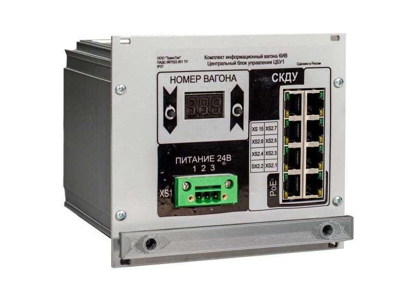 Устройство ЦБУ1 выполняет ключевую роль в комплексе КИВ, выступая в качестве центра сбора, хранения и диспетчеризации данных и отвечающего за информационную инфраструктуру вагона. Предназначен для приема от локальной сети вагона от системы контроля и диагностики (СКДУ) и хранения информационных данных, выводимых на информационные дисплеи (ИД); приема от СКДУ и сохранения полученных параметров настроек; получение информации от ИД о их типе и состоянии; формирования по встроенным шаблонам и передаче на ИД различного исполнения и расположения информационных страниц с информационными данными, полученными от СКДУ, соответствующих расположению и назначению ИД.