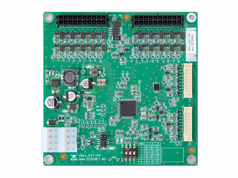Плата управления замками постамата iBox_EXT-04 представляет собой модуль управления стойкой 20 ячейками. Является главным модулем по отношению к модулю DT_iBoxMB-07v2 в системе управления ячейками хранения. Количество таких модулей определяется количеством стоек с ячейками. Модуль проверяет целостность соленоидов замков на обрыв и короткое замыкание, считывает состояние концевого выключателя, управляет открыванием замков. В системе может быть до 8-ти модулей iBox_EXT-04. Каждый модуль имеет свой уникальный номер (MODBUS-адрес в системе), выставляемый переключателями. Значение номера модуля зависит от положения переключателей, которое отражено таблице возле переключателей на плате модуля. Система iBOX предназначена для контроля и управления устройств хранения с электромагнитными замками. Состоит из трех основных типов модулей. Все модули системы соединяются между собой общей четырехпроводной системной шиной для обеспечения питания и передачи данных. Системную шину также предполагается использовать для подключения других модулей, расширяющих функционал системы.